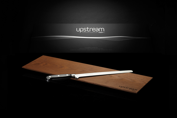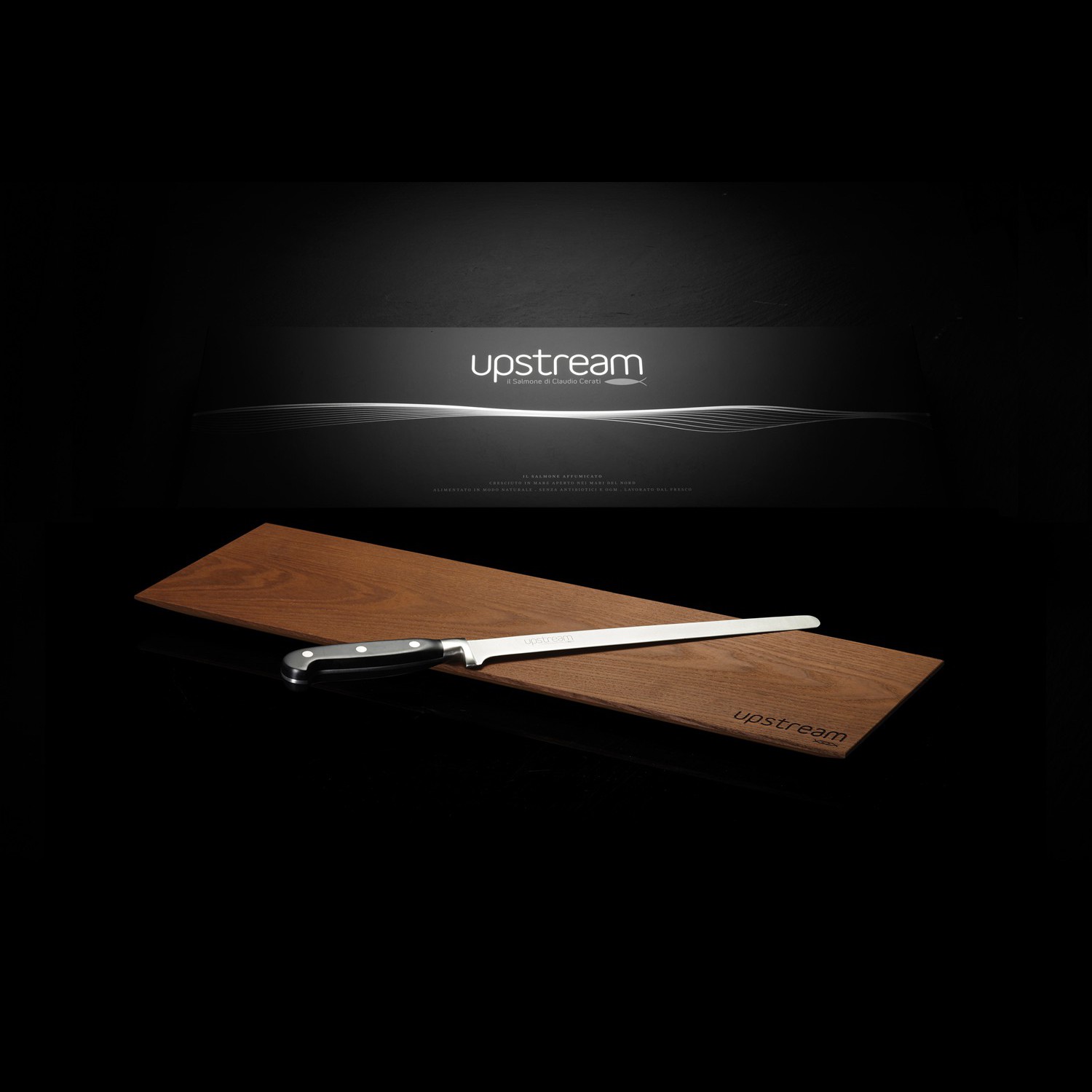 The Royal gift box contains the salmon side, Upstream's flagship product, together with the wooden chopping board and stainless steel knife, essential accessories to serve it at the table with elegance. An original idea to offer the pleasure of savouring a unique taste in a classy presentation.