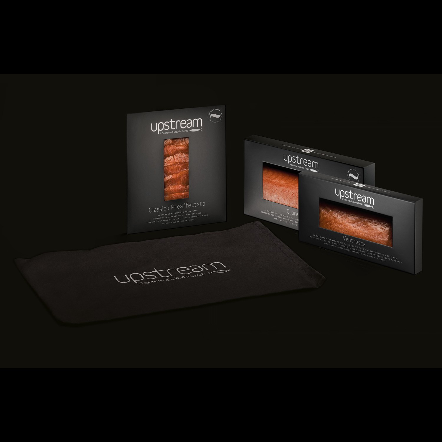 An original comparison between the main flavours of salmon: the Tasting contains the heart fillet , the belly and the sliced classic, enclosing the whole aromatic range of t Upstream flavours.