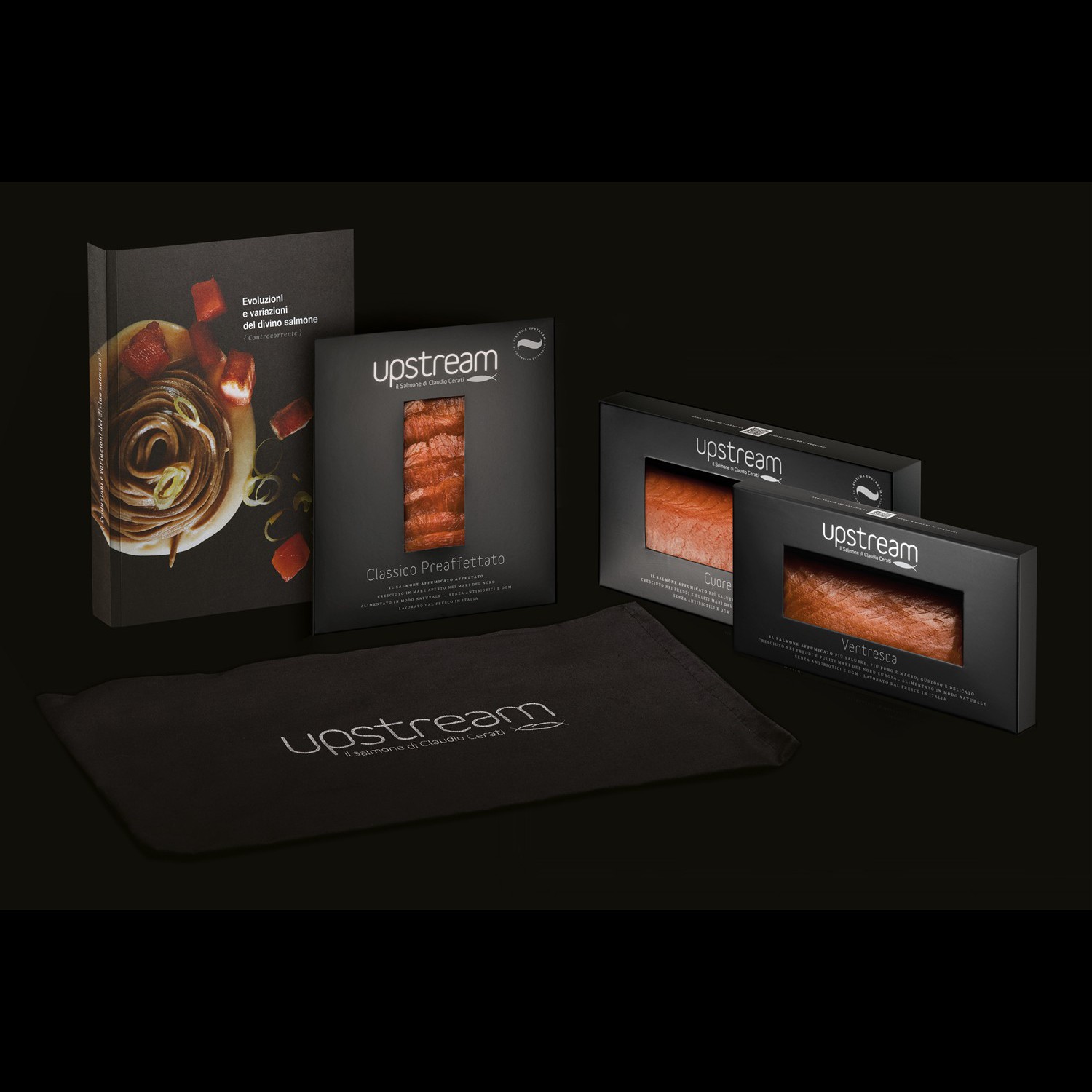 La confezione Tasting & Recipes è un viaggio tra i sapori caratteristici del salmone guidato dalla creatività degli chef amici di Upstream: all’interno il Cuore di filetto, la Ventresca e il Classico preaffettato accompagnati dalle pagine dell’esclusivo libro ricettario.